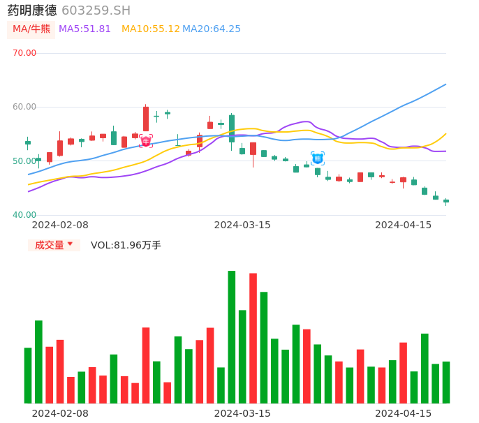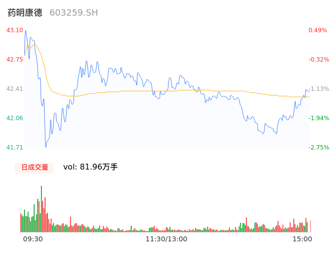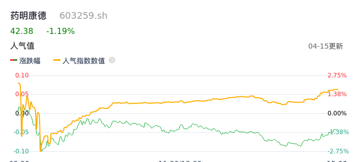 04月15日,药明康德收报42.38,股价涨幅-1.19%,成交金额34.67亿元,换手率3.22%。