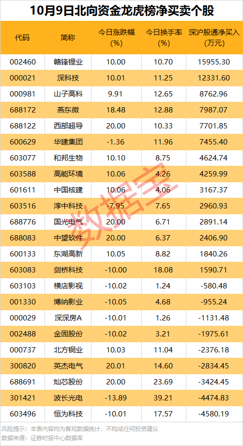 今日龙虎榜现身个股中,14股获北向资金净买入。净买入居首的同样是赣锋锂业,金额为1.6亿元;深科技、山子高科、燕东微分别获净买入1.23亿元、8762.96万元、7987.07万元。