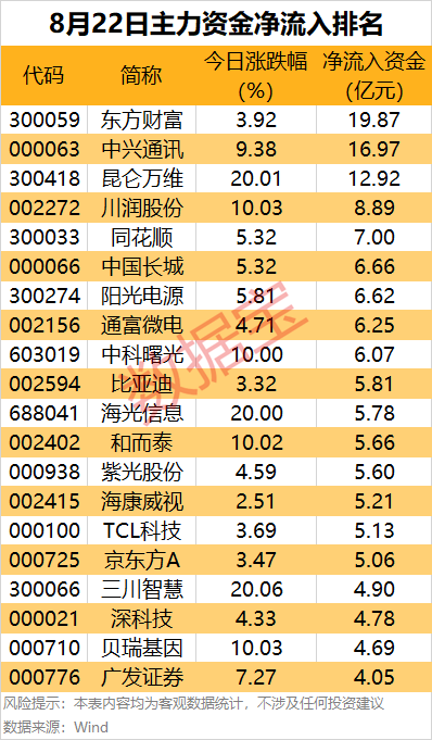 互联网券商龙头股东方财富主力资金净流入19.87亿元,居首;该股今日成交额达249.7亿元,也居首位,股价上涨3.92%。热门通信龙头中兴通讯主力资金净流入16.97亿元,居次席,股价逼近涨停。