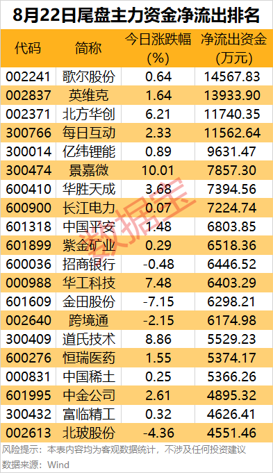 4股尾盘主力资金净流出均超1亿元,分别为歌尔股份、英维克、北方华创和每日互动。