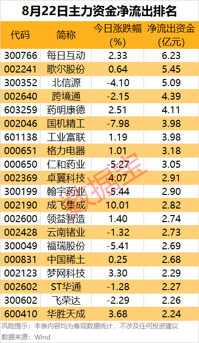 22个主力资金净流出的行业中,医药生物行业净流出金额居首,达32.73亿元;基础化工行业净流出金额为22.44亿元,有色金属、机械设备、汽车、电力设备和农林牧渔行业净流出金额居前,均超10亿元。