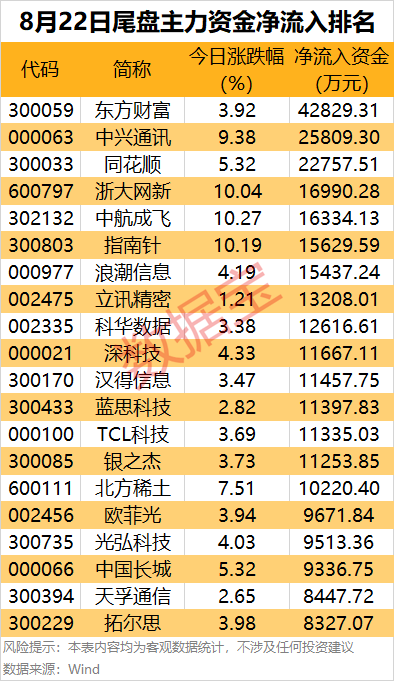 东方财富尾盘主力资金净流入4.28亿元,居首;中兴通讯和同花顺尾盘净流入金额均超2亿元。