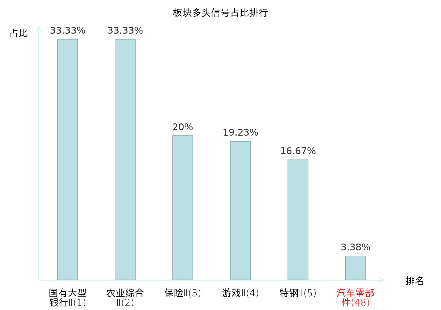 全市场所有行业板块中主力多头信号占比排名中,国有大型银行Ⅱ板块位居第一。农业综合Ⅱ板块名次提升最快,较昨日上升127位。