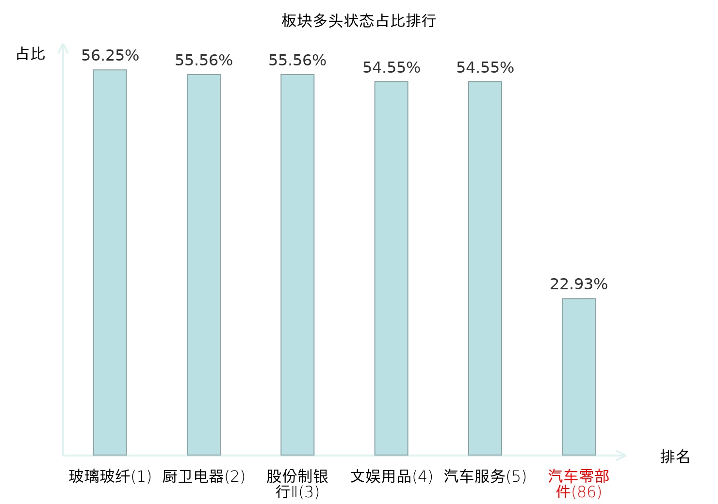 全市场所有行业板块中主力多头状态占比排名中,玻璃玻纤板块位居第一。航天装备Ⅱ板块名次提升最快,较昨日上升84位。
