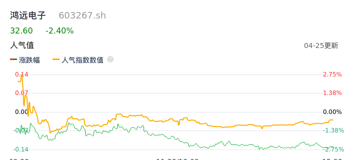 04月25日,鸿远电子收报32.60,股价涨幅-2.40%,成交金额1.53亿元,换手率2.02%。