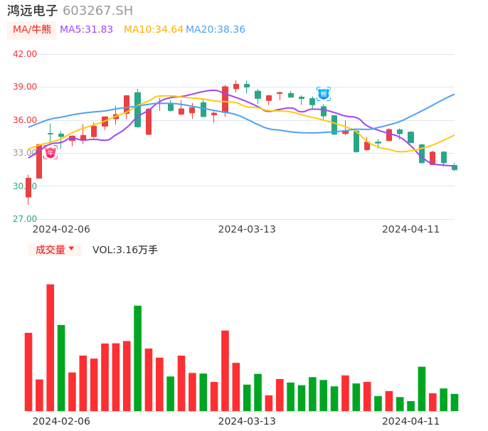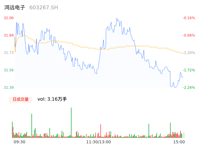 04月11日,鸿远电子收报31.48,股价涨幅-1.96%,成交金额1.00亿元,换手率1.36%。