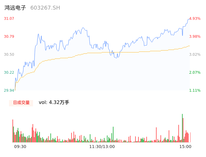 04月17日,鸿远电子收报31.07,股价涨幅4.93%,成交金额1.32亿元,换手率1.86%。