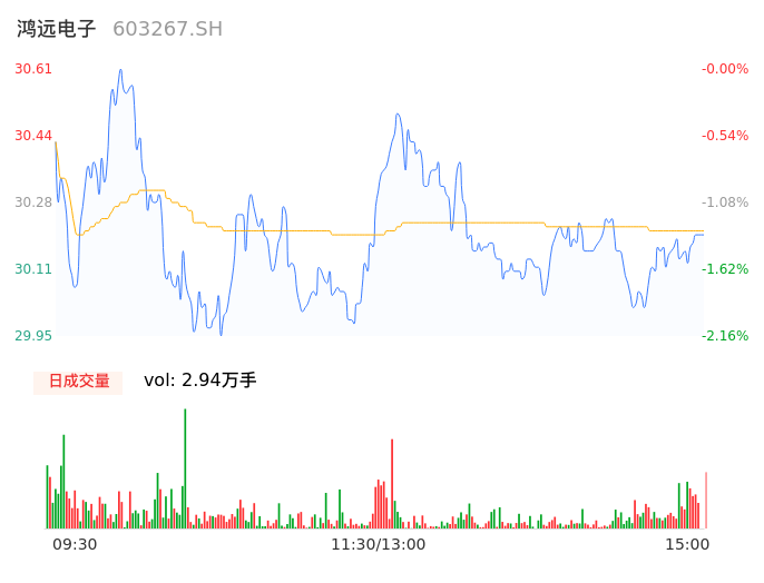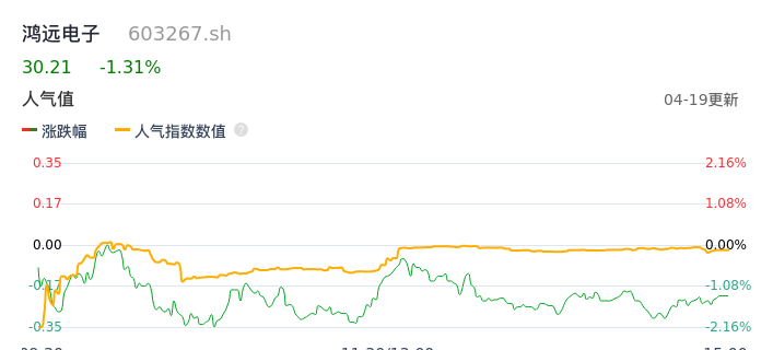 04月19日,鸿远电子收报30.21,股价涨幅-1.31%,成交金额8869.53万元,换手率1.27%。