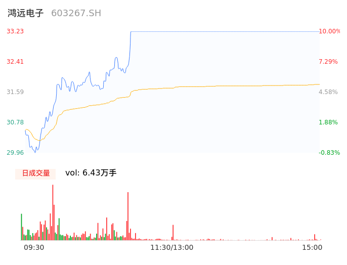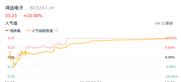 04月22日,鸿远电子收报33.23,股价涨幅10.00%,成交金额2.04亿元,换手率2.77%。
