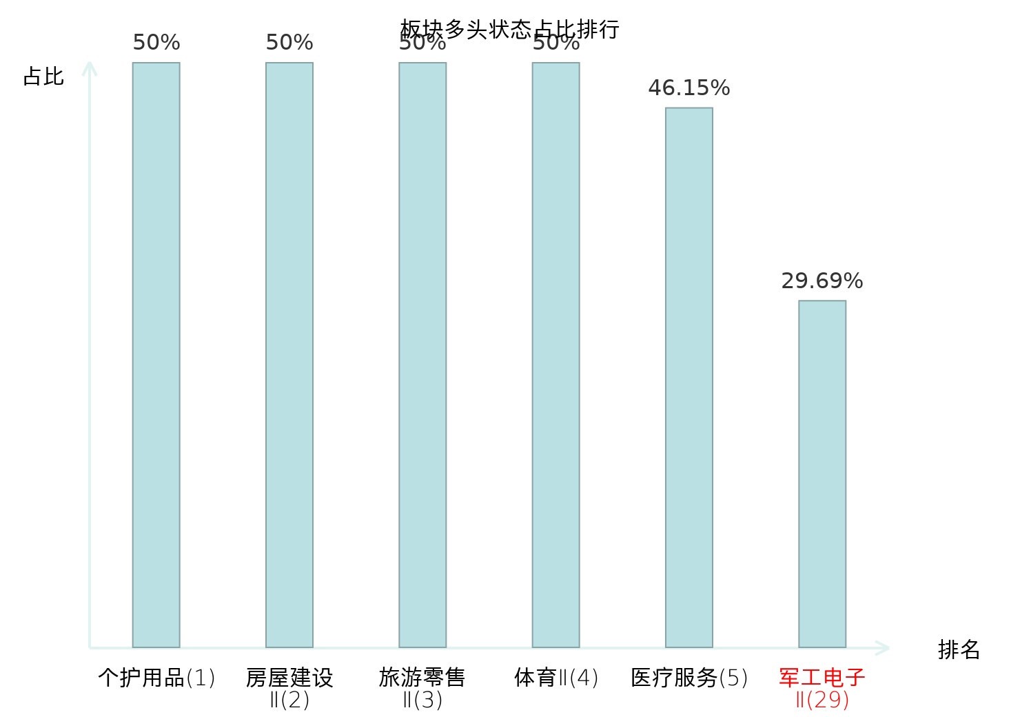 全市场所有行业板块中主力多头状态占比排名中,个护用品板块位居第一。影视院线板块名次提升最快,较昨日上升56位。
