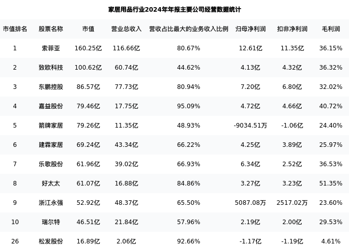 松发股份最新报告期数据为年报,下表汇总了家居用品行业内市值靠前的公司年报主要经营数据