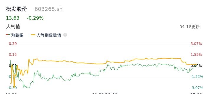 04月18日,松发股份收报13.63,股价涨幅-0.29%,成交金额1977.45万元,换手率1.18%。