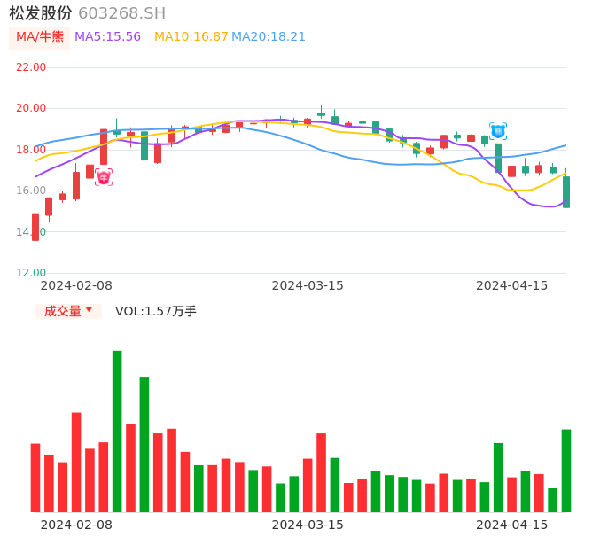 04月15日,松发股份收报15.18,股价涨幅-10.02%,成交金额2445.56万元,换手率1.27%。