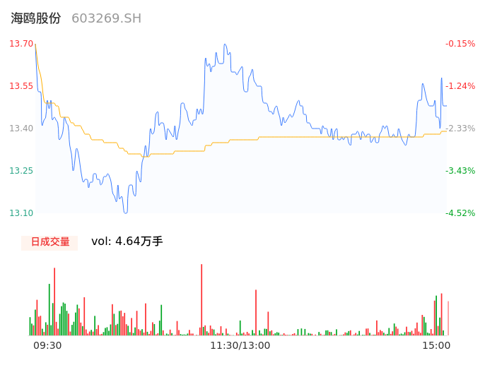 04月03日,海鸥股份收报13.57,股价涨幅-1.09%,成交金额6208.82万元,换手率2.94%。