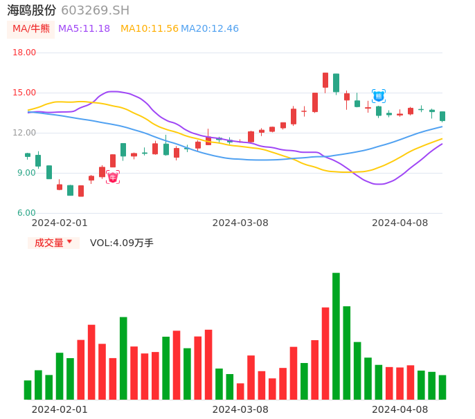 04月08日,海鸥股份收报12.90,股价涨幅-4.94%,成交金额5329.78万元,换手率2.60%。