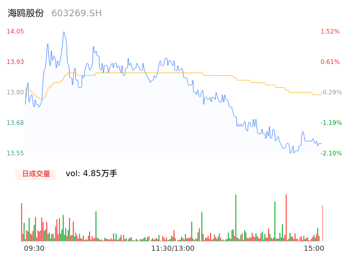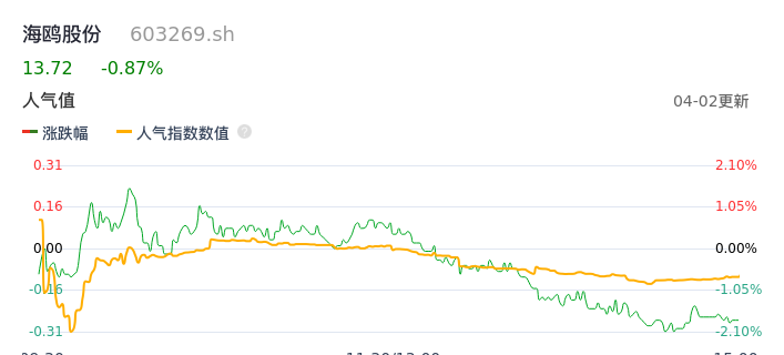 04月02日,海鸥股份收报13.72,股价涨幅-0.87%,成交金额6682.93万元,换手率3.08%。