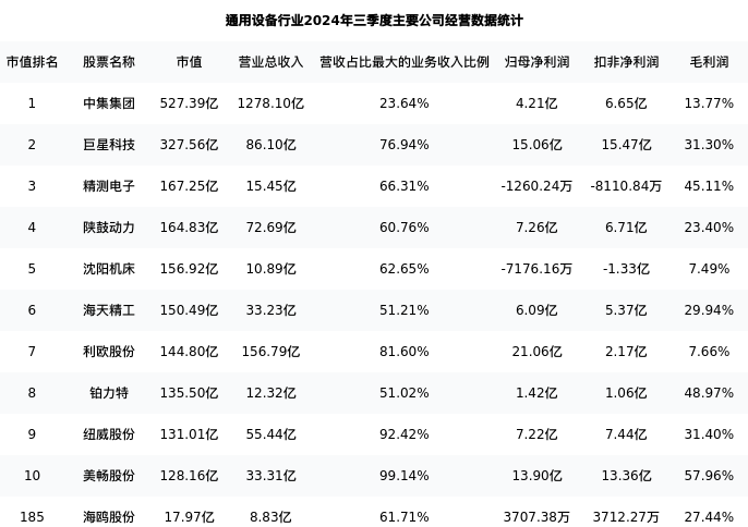 海鸥股份最新报告期数据为三季度,下表汇总了通用设备行业内市值靠前的公司三季度主要经营数据