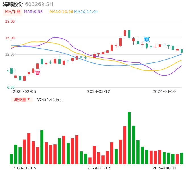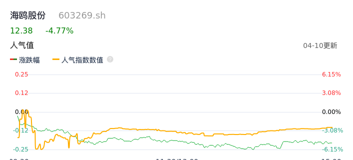 04月10日,海鸥股份收报12.38,股价涨幅-4.77%,成交金额5730.56万元,换手率2.93%。