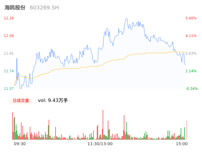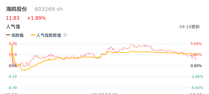 04月18日,海鸥股份收报11.83,股价涨幅1.89%,成交金额1.13亿元,换手率6.00%。