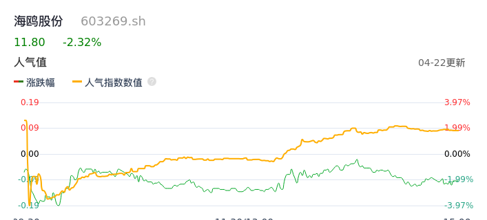 04月22日,海鸥股份收报11.80,股价涨幅-2.32%,成交金额3955.12万元,换手率2.12%。