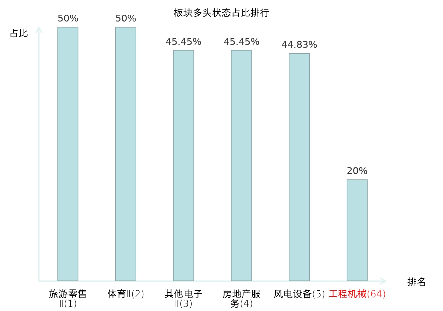 全市场所有行业板块中主力多头状态占比排名中,旅游零售Ⅱ板块位居第一。其他家电Ⅱ板块名次提升最快,较昨日上升112位。