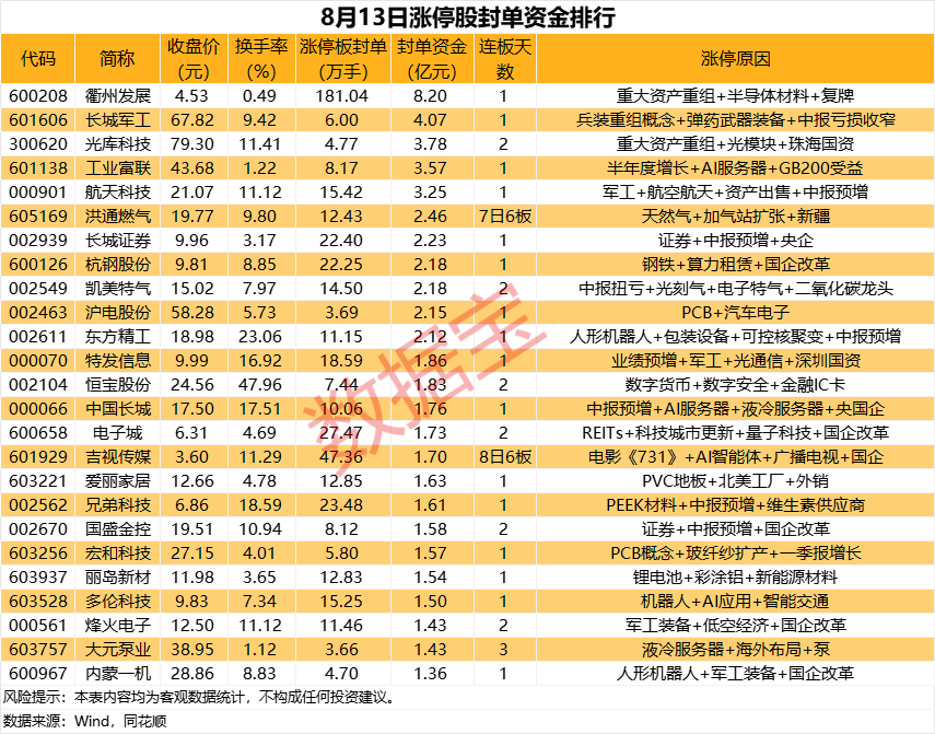 以封单金额计算,37股封单资金超1亿元,衢州发展、长城军工、光库科技封单资金居前,分别为8.2亿元、4.07亿元、3.78亿元。