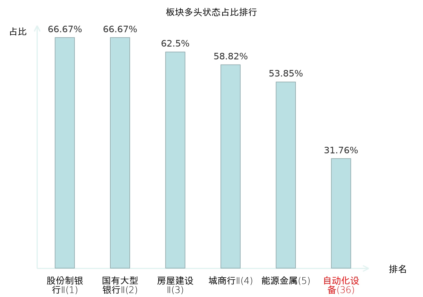 全市场所有行业板块中主力多头状态占比排名中,股份制银行Ⅱ板块位居第一。航空机场板块名次提升最快,较昨日上升68位。
