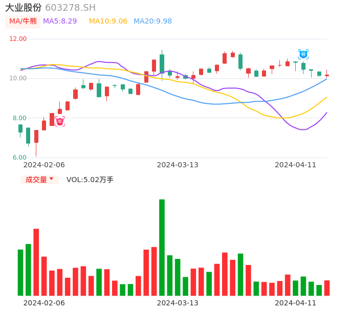 04月11日,大业股份收报10.18,股价涨幅0.39%,成交金额5159.28万元,换手率1.47%。