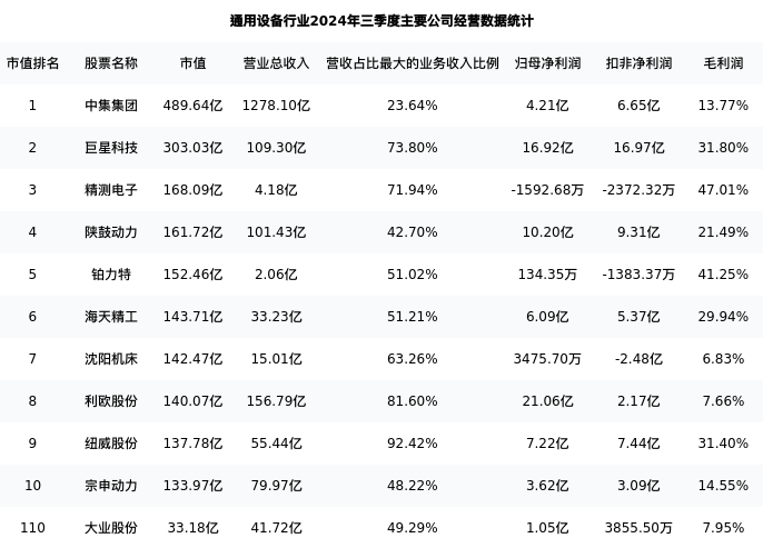 大业股份最新报告期数据为三季度,下表汇总了通用设备行业内市值靠前的公司三季度主要经营数据