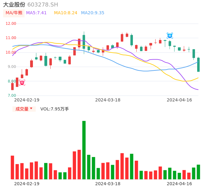 04月16日,大业股份收报8.66,股价涨幅-9.98%,成交金额7129.59万元,换手率2.33%。