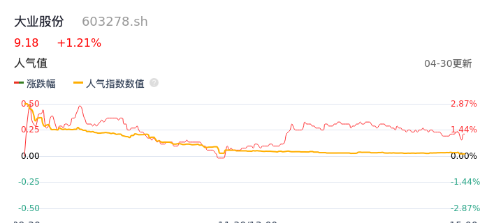 04月30日,大业股份收报9.18,股价涨幅1.21%,成交金额3936.35万元,换手率1.25%。