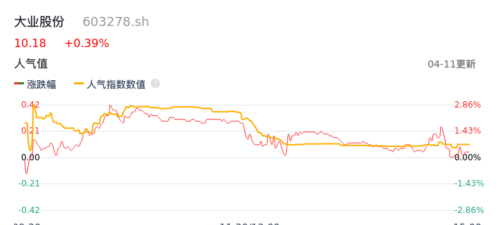 04月11日,大业股份收报10.18,股价涨幅0.39%,成交金额5159.28万元,换手率1.47%。