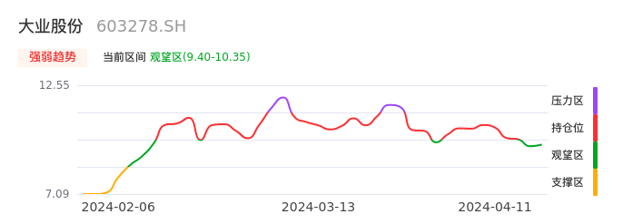 我们来看一下该股的九方特色指标强弱趋势的情况:大业股份近日从持仓区下穿到观望区,股价出现持续调整。短期出现止跌态势,后续重点关注能否再次站上多空分界点:10.35元。如未能有效突破则可能进入新一轮空头行情。