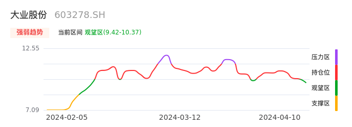 我们来看一下该股的九方特色指标强弱趋势的情况:大业股份近日从持仓区下穿到观望区,股价出现持续性调整行情。短期已经转为空头行情,且下跌动能仍未衰竭。建议继续谨慎观望。