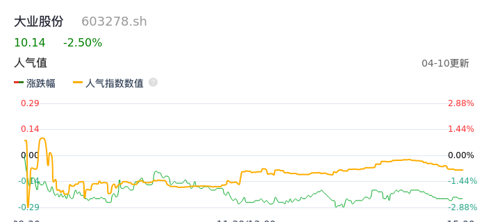 04月10日,大业股份收报10.14,股价涨幅-2.50%,成交金额3583.93万元,换手率1.03%。