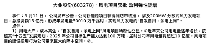 值得注意的是:2024年03月中泰证券的冯胜分析师,首次发布关于大业股份的研究报告,标题为:大业股份(603278):风电项目获批 盈利弹性陡增。
