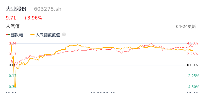 04月24日,大业股份收报9.71,股价涨幅3.96%,成交金额3988.85万元,换手率1.22%。
