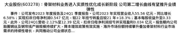 值得注意的是:2024年04月东兴证券的张天丰分析师,首次发布关于大业股份的研究报告,标题为:大业股份(603278):骨架材料业务进入实质性优化成长新阶段 公司第二增长曲线有望推升业绩弹性。