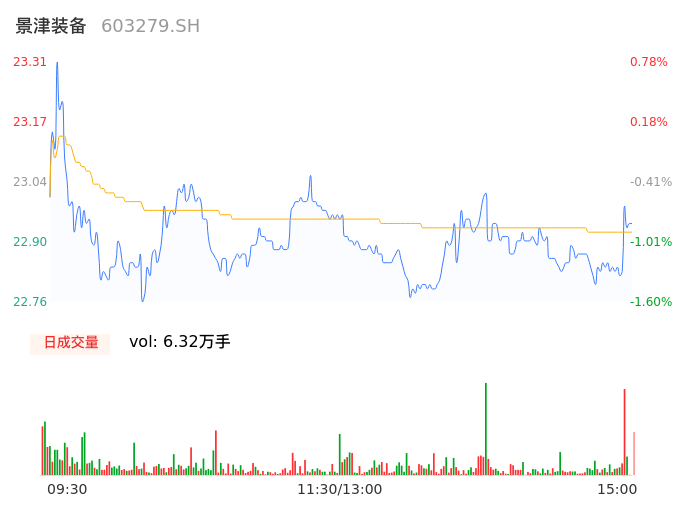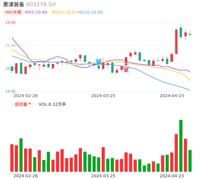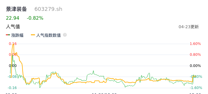 04月23日,景津装备收报22.94,股价涨幅-0.82%,成交金额1.45亿元,换手率1.11%。