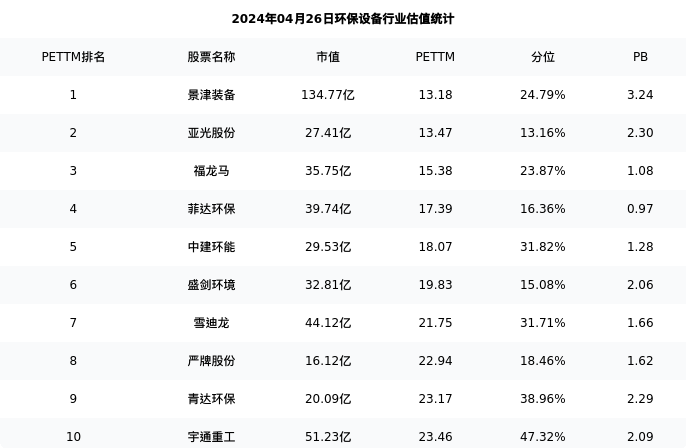 从估值角度看:景津装备最新市盈率PETTM为13.18,在行业内排名1/28,处于24.79分位。