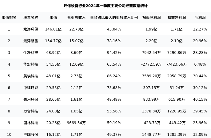 景津装备最新报告期数据为一季度,下表汇总了环保设备行业内市值靠前的公司一季度主要经营数据