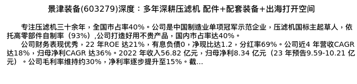值得注意的是:2024年03月上海申银万国证券研究所的莫龙庭/王珂/何佳霖分析师,首次发布关于景津装备的研究报告,标题为:景津装备(603279)深度:多年深耕压滤机 配件+配套装备+出海打开空间。
