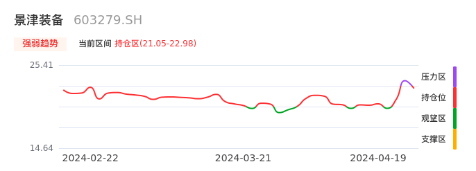 我们来看一下该股的九方特色指标强弱趋势的情况:景津装备近日从压力区回到持仓区。股价快速拉升后出现持续调整。后续主要关注下方支撑位:21.05元是否能启稳回升。