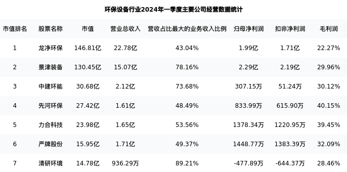 景津装备最新报告期数据为一季度,下表汇总了环保设备行业内市值靠前的公司一季度主要经营数据