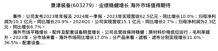 值得注意的是:2024年04月西南证券的邰桂龙/王宁分析师,首次发布关于景津装备的研究报告,标题为:景津装备(603279):业绩稳健增长 海外市场值得期待。
