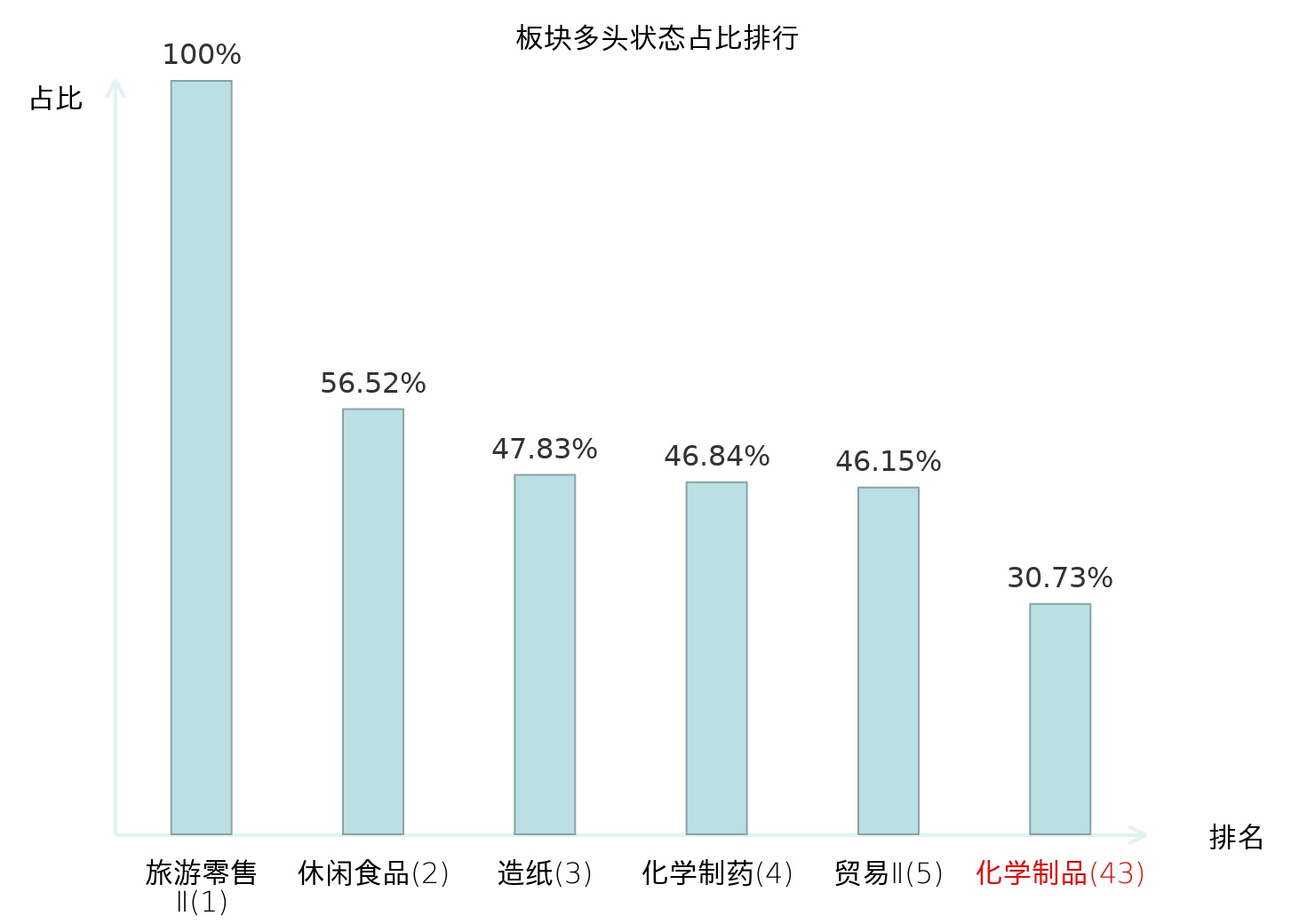 全市场所有行业板块中主力多头状态占比排名中,旅游零售Ⅱ板块位居第一。动物保健Ⅱ板块名次提升最快,较昨日上升58位。