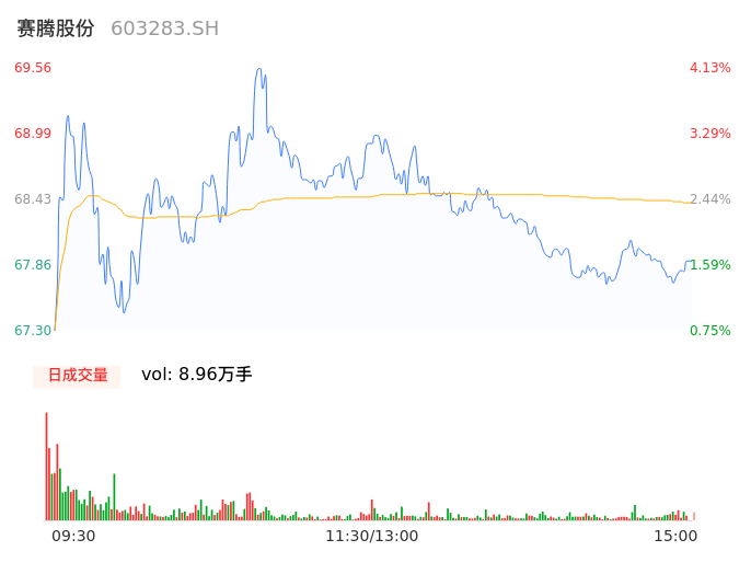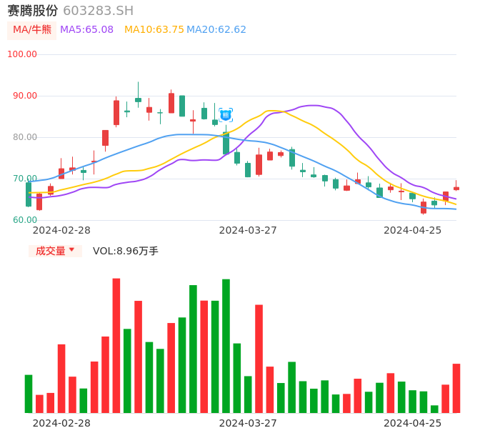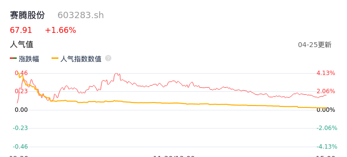 04月25日,赛腾股份收报67.91,股价涨幅1.66%,成交金额6.13亿元,换手率4.82%。