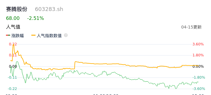 04月15日,赛腾股份收报68.00,股价涨幅-2.51%,成交金额3.82亿元,换手率2.99%。
