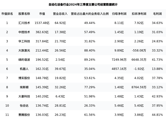 赛腾股份最新报告期数据为三季度,下表汇总了自动化设备行业内市值靠前的公司三季度主要经营数据