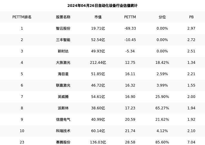 从估值角度看:赛腾股份最新市盈率PETTM为28.58,在行业内排名20/80,处于85.60分位。